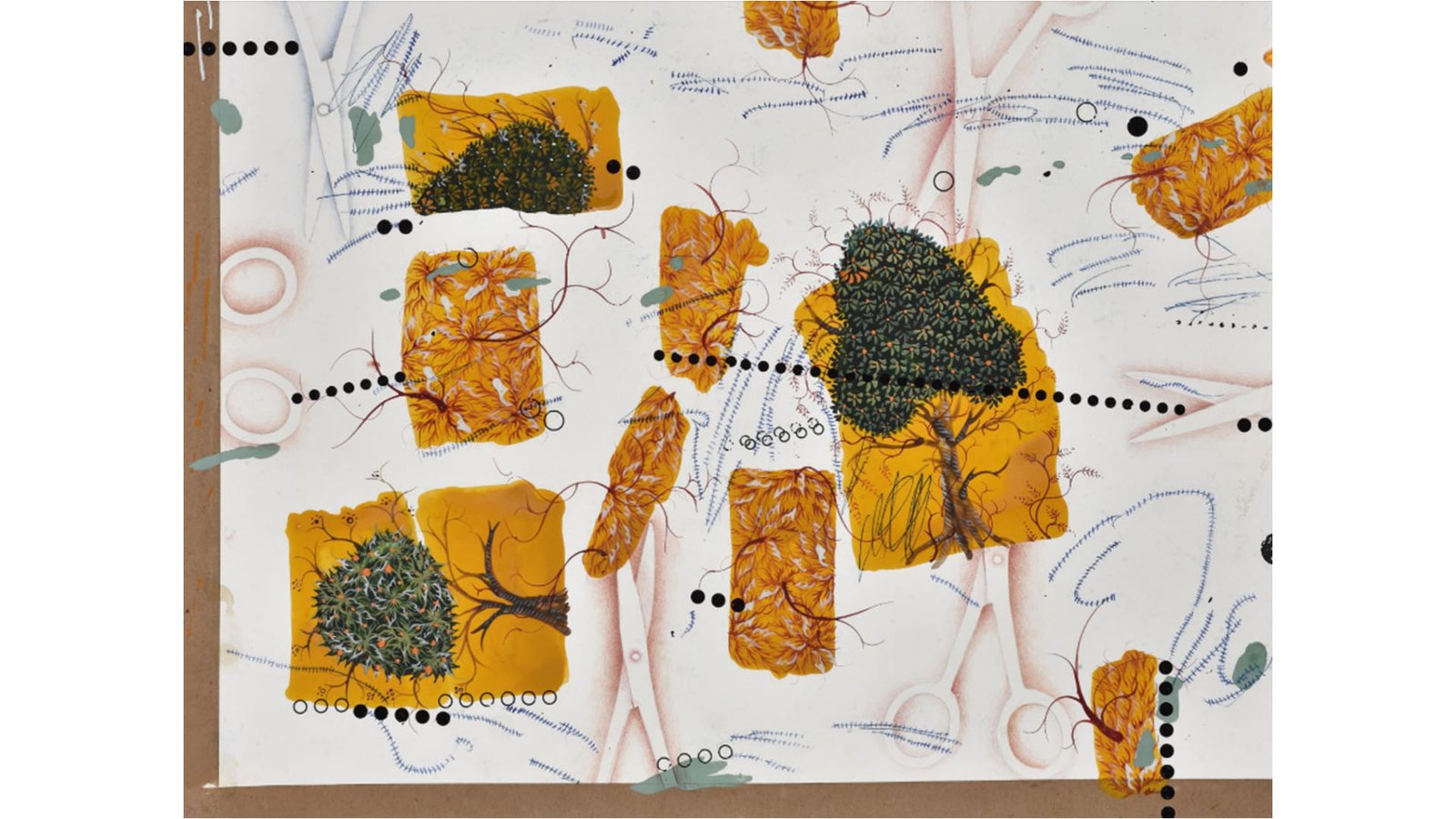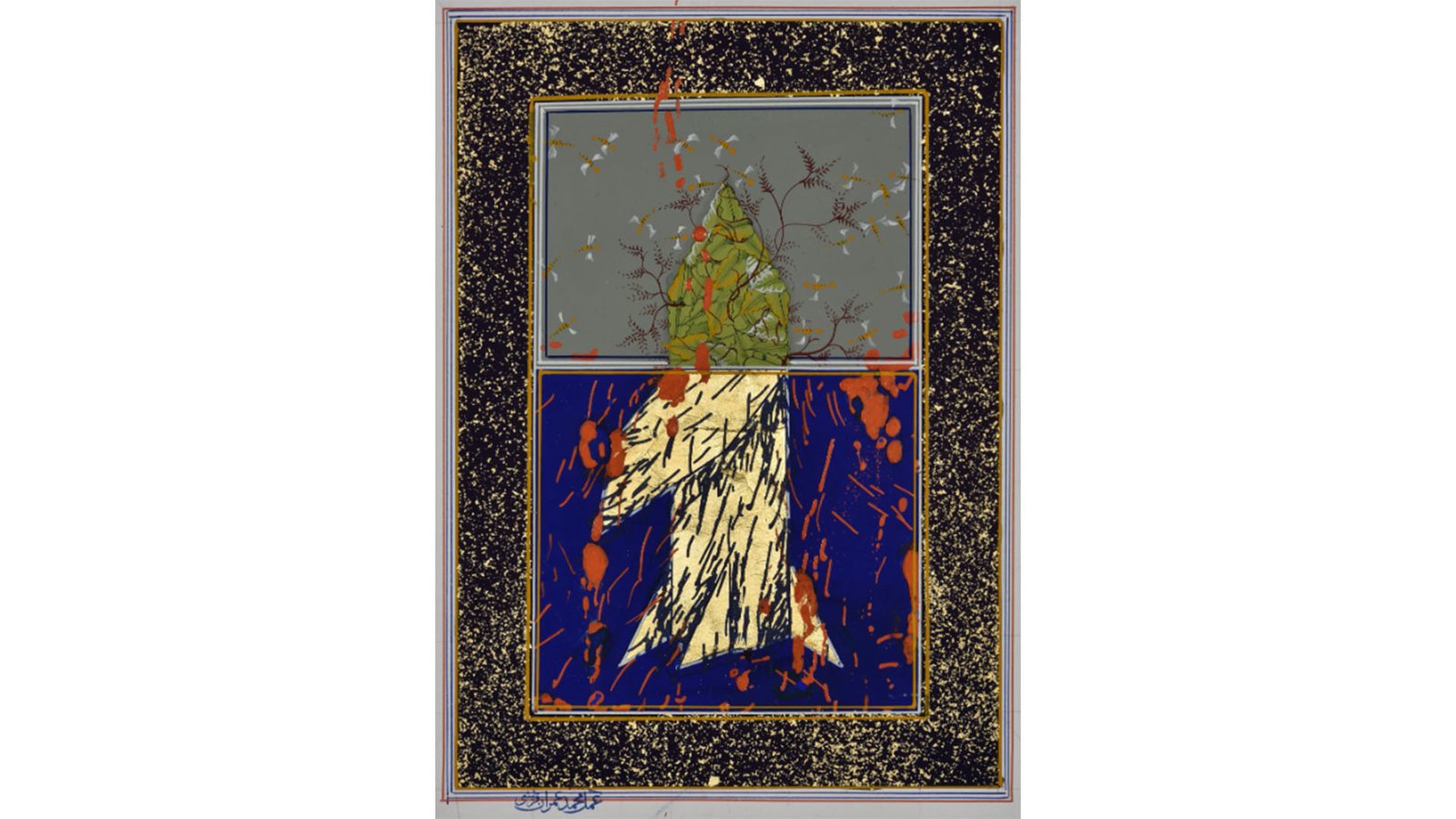 Imran Qureshi has developed a contemporary practice rooted in the tradition of 16th-century Mughal miniature art, encompassing figurative and abstract works on paper, monumental paintings and site-specific installations. His work constitutes a unique synthesis of traditional motifs and techniques with current issues and the formal language of contemporary abstract painting. He combines traditional motifs, techniques and symbolism with conceptual ideas, oscillating between an unparalleled attention to detail and a gestural energy reminiscent of Action Painting. The use of gold leaf and red acrylic paint is a distinctive feature of his work. The luminosity of gold-leaf alludes to the celestial plane, in contrast to the vibrant splashes of red and ornate vine motifs that become symbolic of the vulnerability of the human body.