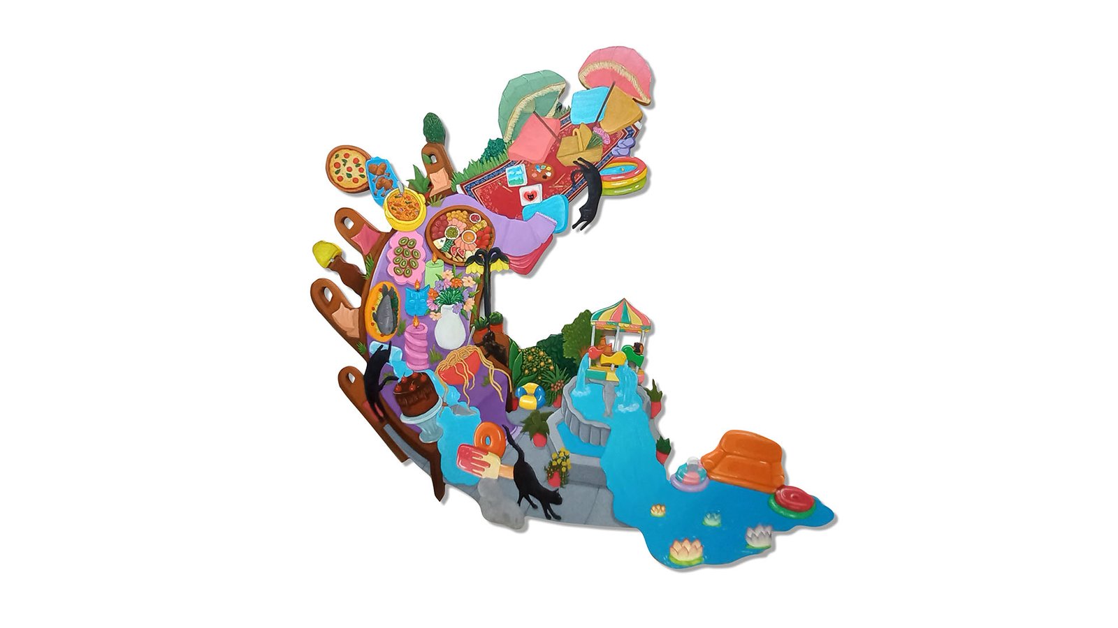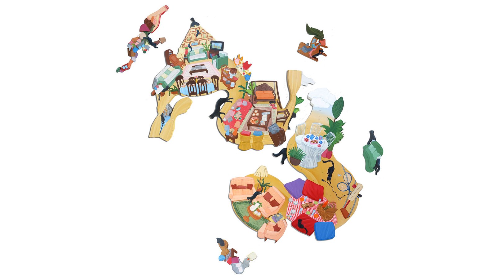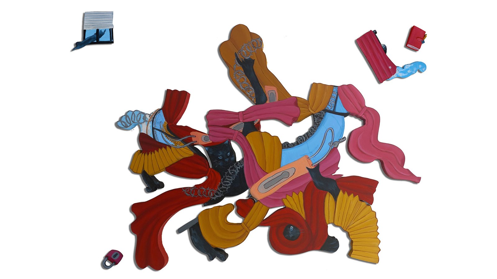 Schajya looks at her home and immediate surroundings as a main source of inspiration for her compositions. Her pieces follow a continuous narrative through the ‘black cat’ that is seen exploring the spaces within the paintings.
