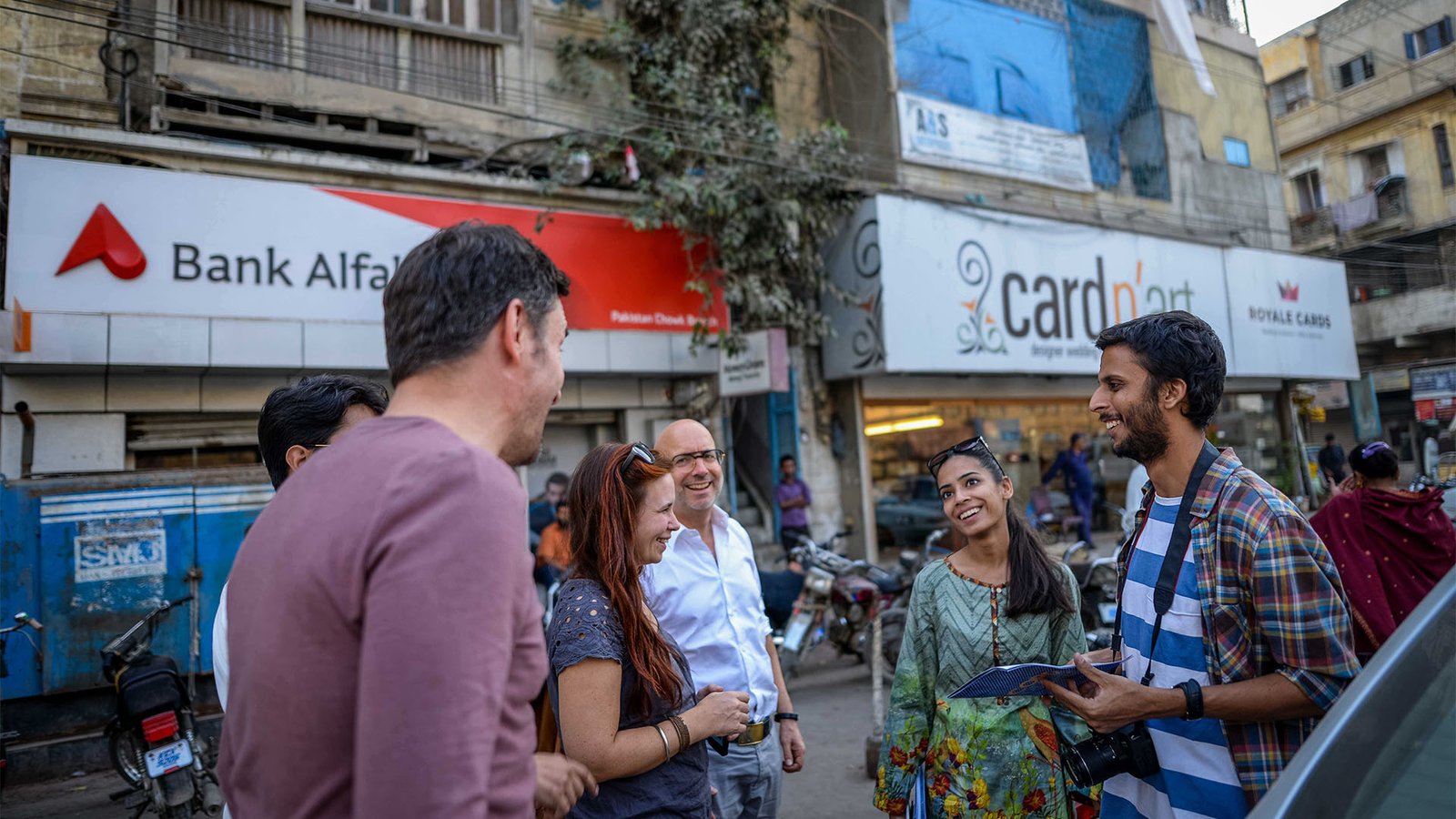 Towards the end of his residency, Craemer also took his mobile installation to different parts of Karachi to document his art work as an ‘urban intervention’. The Cord of Desires was viewed by a larger audience, unfamiliar with contemporary art. The bazaars and open spaces of Karachi such as Empress Market and Pakistan Chowk created a stimulating backdrop and surrounding, allowing the flags to be viewed in another context by the passer bys, facilitators and the artist himself. The urban intervention was undoubtedly a spontaneous yet exciting addition to the series of projects under the Urbanities umbrella. For Craemer, Cord of Desires became a visualization of a global topic. At the conclusion of the Urbanities project, Craemer transported the installation back to his hometown in Munich to display it to a German audience.