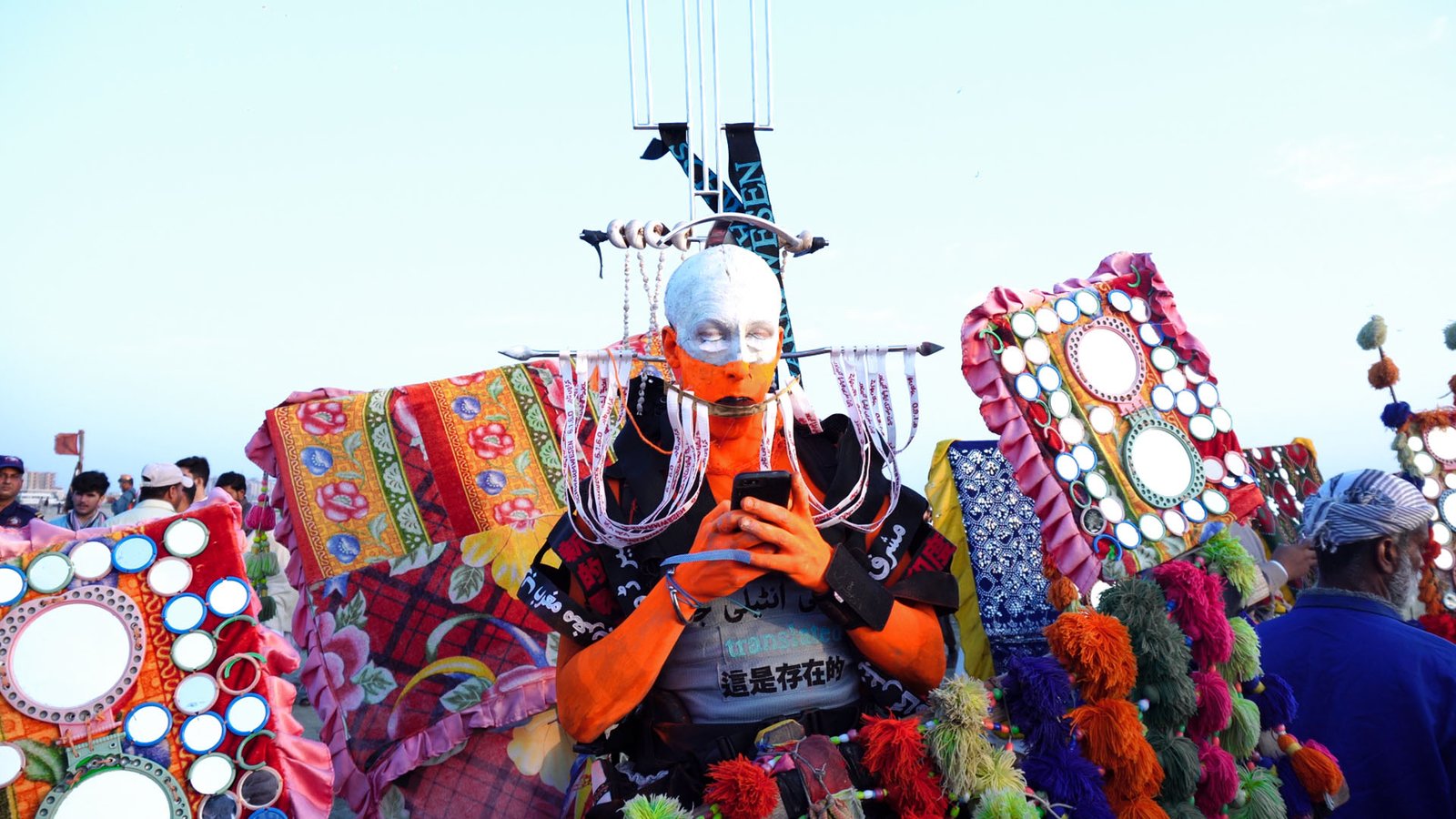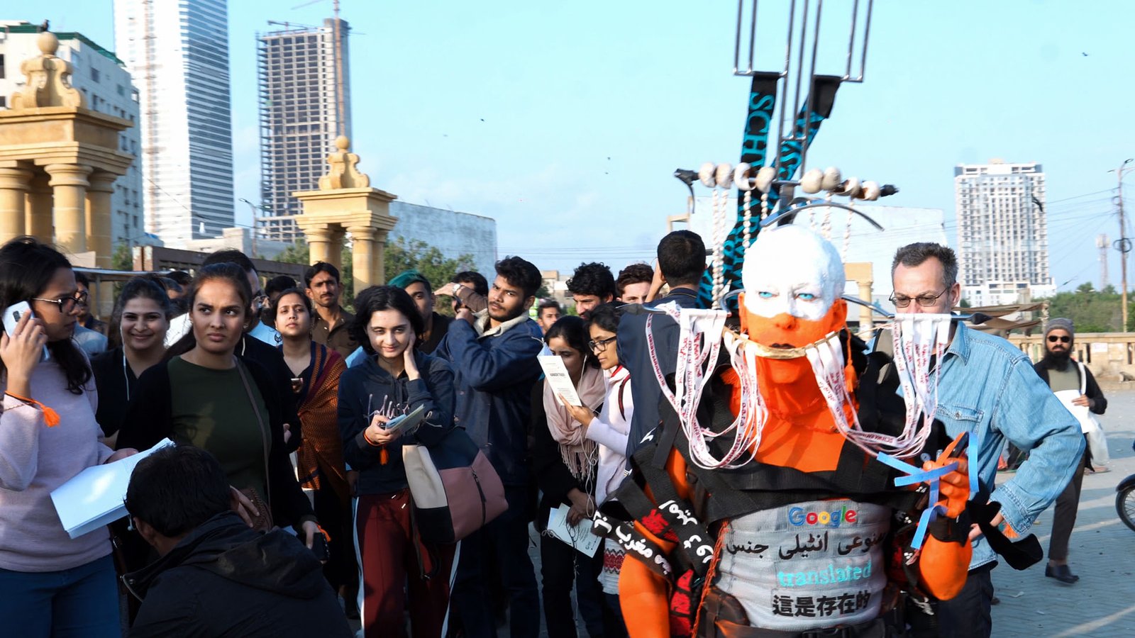 It is a being which continues the lifeline of Schwarmwesen (swarm-being) a tongueless roaming pet of the European tourist sites [6.0.X and 6.1.X] researching its developing terms such as “Geopathology“, “Chronostrophy and “Capitalotrophy“. In Karachi, this being has reached its own “Forking horizon“ a process of making a new version of itself. A process of becoming other with oneself.