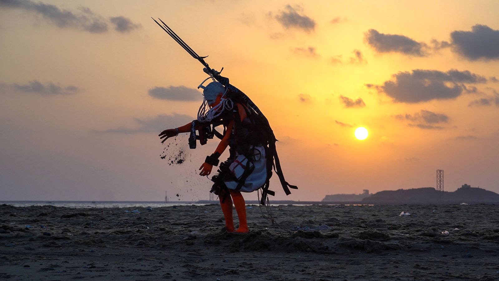 The Karachi Trader is a ghostly being that haunts the city’s seaside from devils point criss crossing the popular beach, the western mall and a black river towards the China Port’s future deserts.