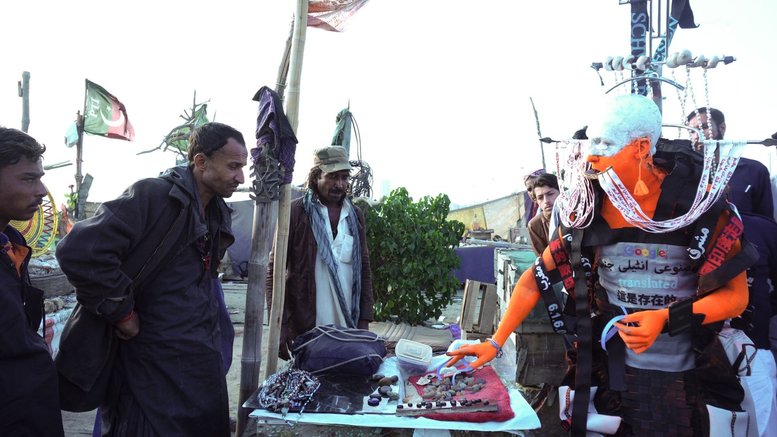 Karachi Trader visits the site, its people and non-human beings that inhabit this terrain. It traverses “them-as-us“ and speaks through “us-as-them“. Language devices, a set of voices stored on the being’s artificial tongue, babble in never ending translations. A Trader of language and dialects. A trader of forms of trade. A trader of artifacts and small commodities shipped along the belt and roads of a microcosmic spot that is simultaneously interweaved with “anysite” on the planet.